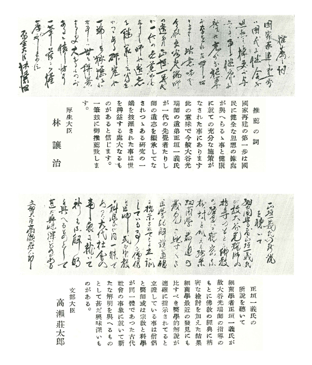 講演は昭和24年11月4日と昭和25年1月25日の2回にわたり「長寿論と有効細菌」と題して行われ、文部大臣、厚生大臣から賞詞を受領しております。